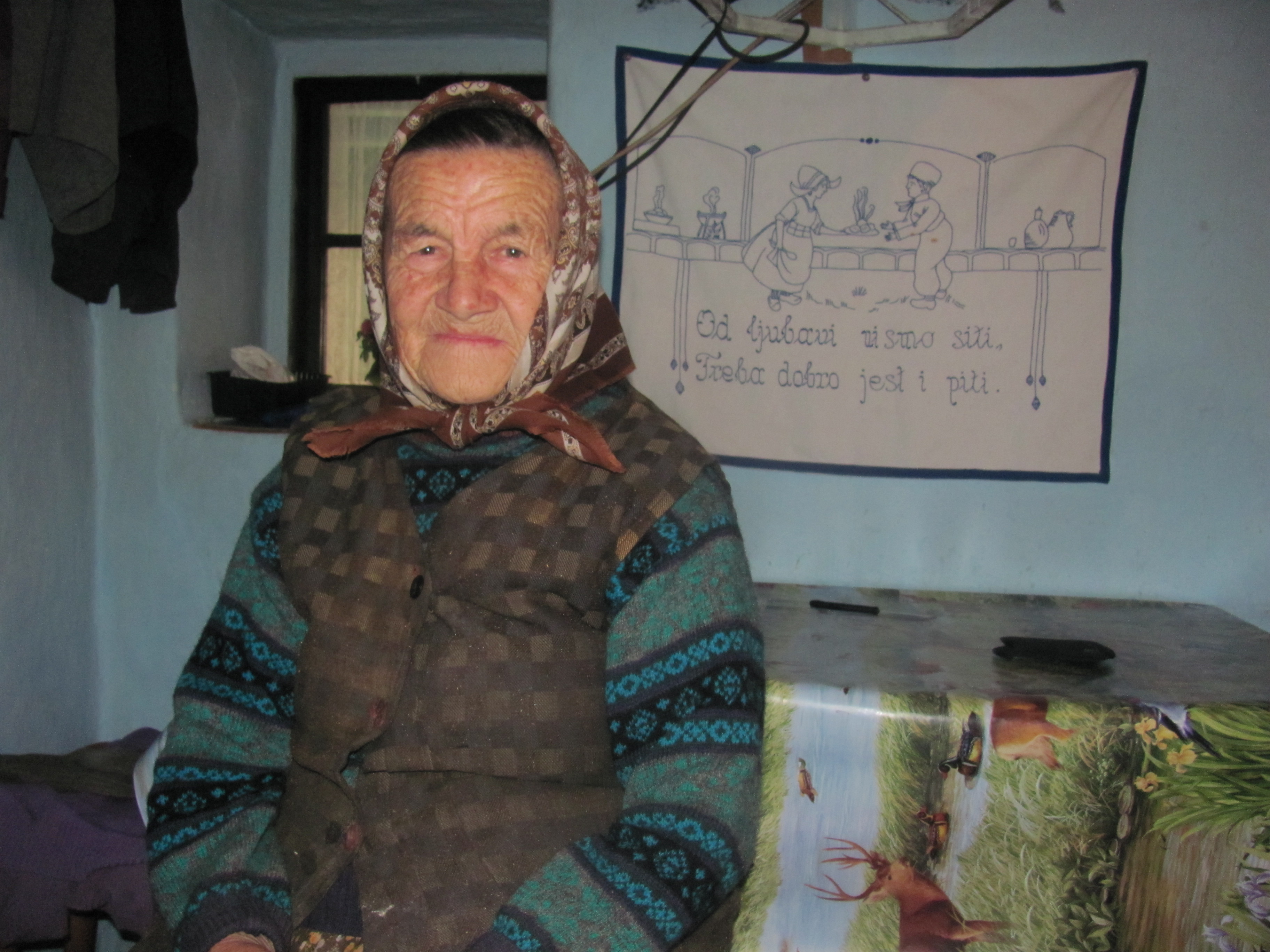 Zid u kuhinji baka je ukrasila izvezenim zidnjakom na kojem piše: „Od ljubavi nismo siti, treba dobro jest i piti“. Zidnjak je na poklon dobila od svoje svekrve.