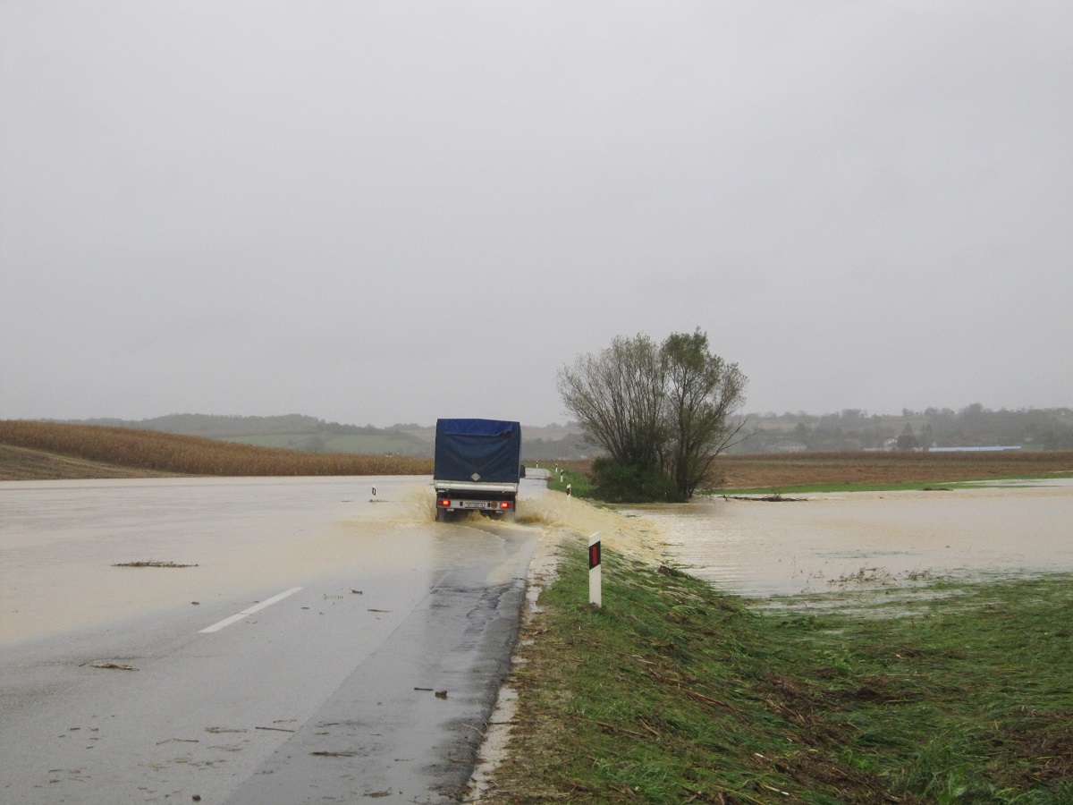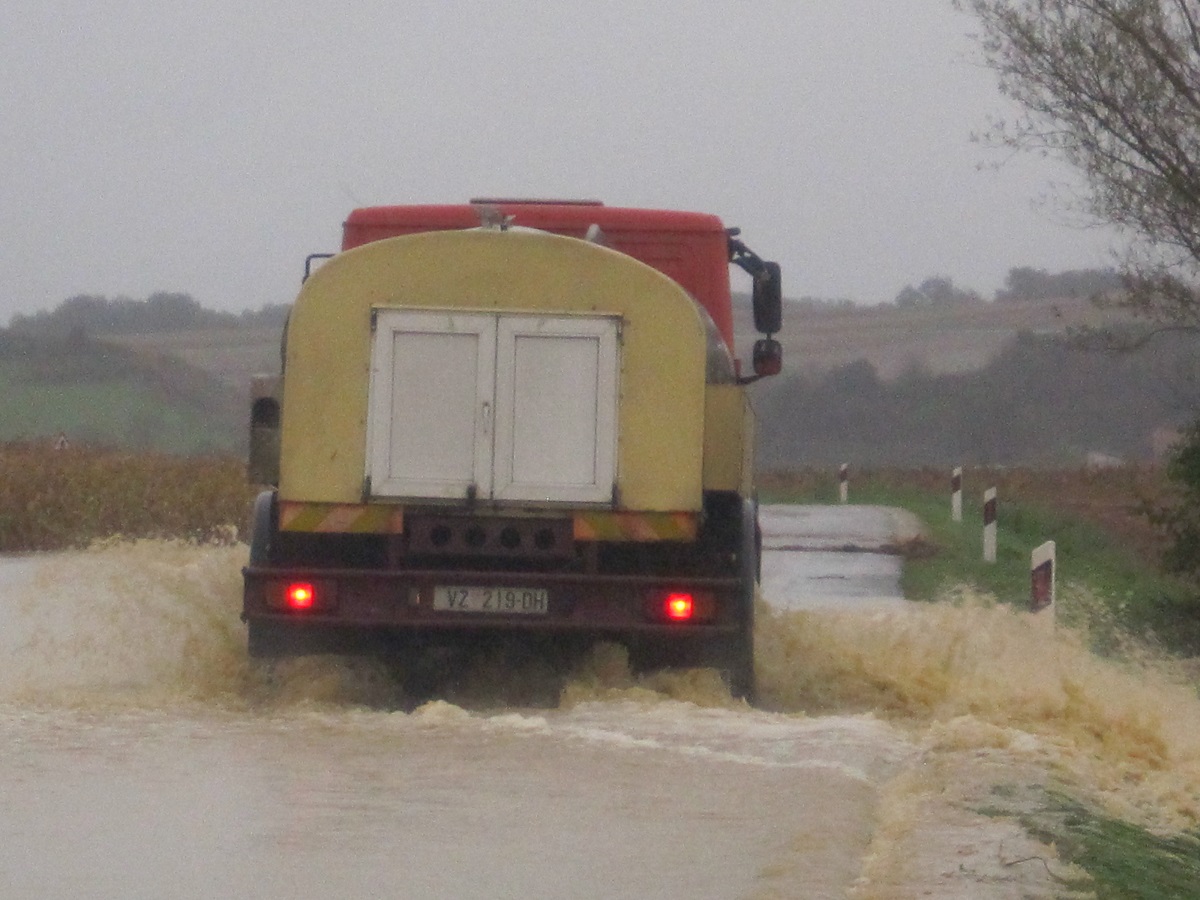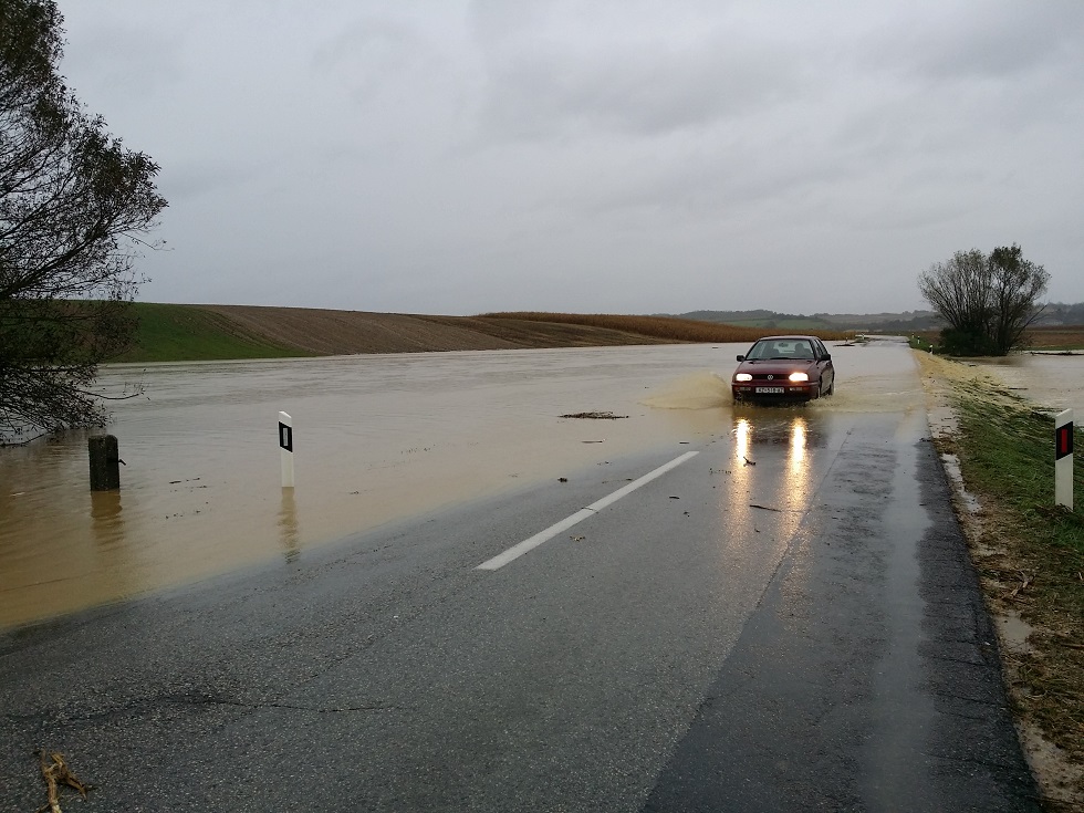Novinarke iz 8.a fotografirale su dio poplavljene prometnice kod skretanja u mjesto Međa. Pogledajte kako je tamo izgledalo oko 9 sati. Samo hrabri su ipak prolazili. /Veronika Tomak, Lorena Hubina, 8. a; fotografije V.T.i S.L./