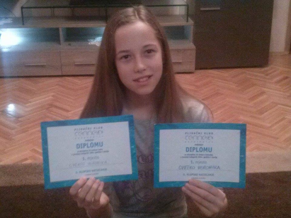 Naporno treniranje već je počelo davati i rezultate i naša je Veronika ljetos pobijedila na klupskom natjecanju u Koprivnici, a izvrsna je bila i na natjecanju u Varaždinskim toplicama. Prvo mjesto u Koprivnici osvojila je u dvije discipline, prsno i leđno na 25 metara. Na natjecanju u Varaždinskim toplicama bila je četvrta u disciplini prsno na 100 metara. /Anita Ivšak, 7.a; fotografije A.I./