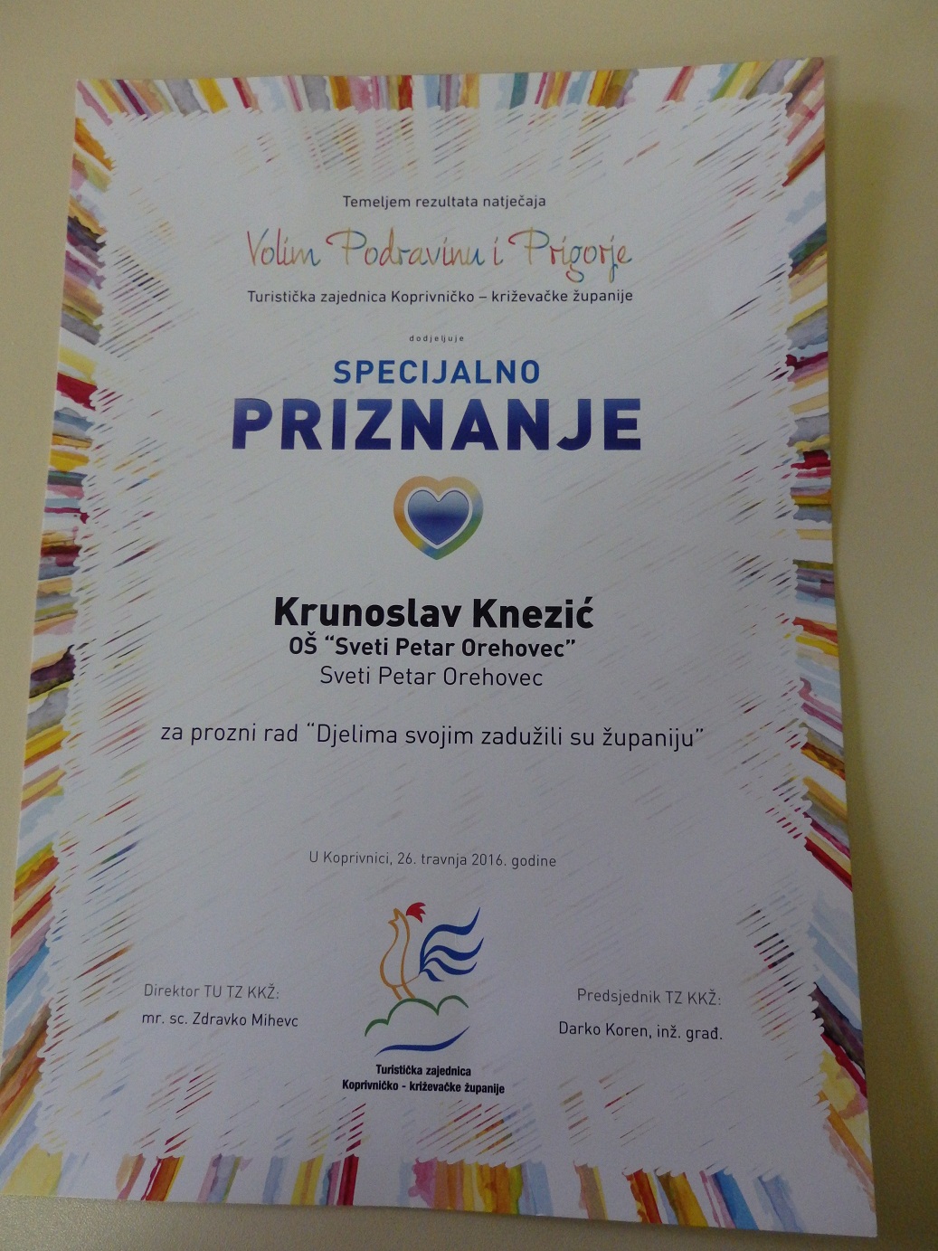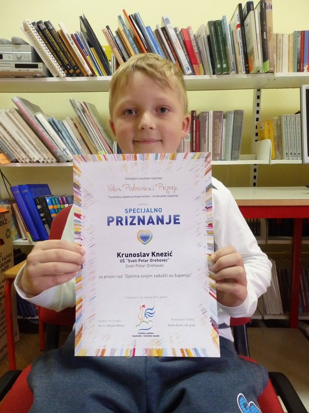 Četvrtaš Krunoslav Knezić dobitnik je specijalnog priznanja na natječaju “Volim Podravinu i Prigorje”, za svoj literarni rad. Natječaj je organizirala Turistička zajednica Koprivničko-križevačke županije, a Krunoslav je priznanje primio u Koprivnici 27. travnja. Dodjeli su prisustvovali i Krunoslavova mentorica Marina Golec i ravnatelj Stjepan Lučki.