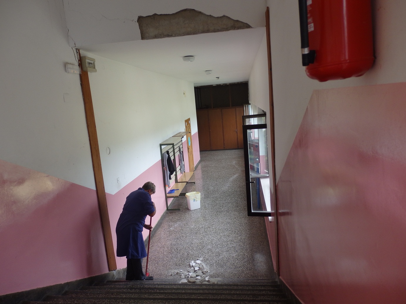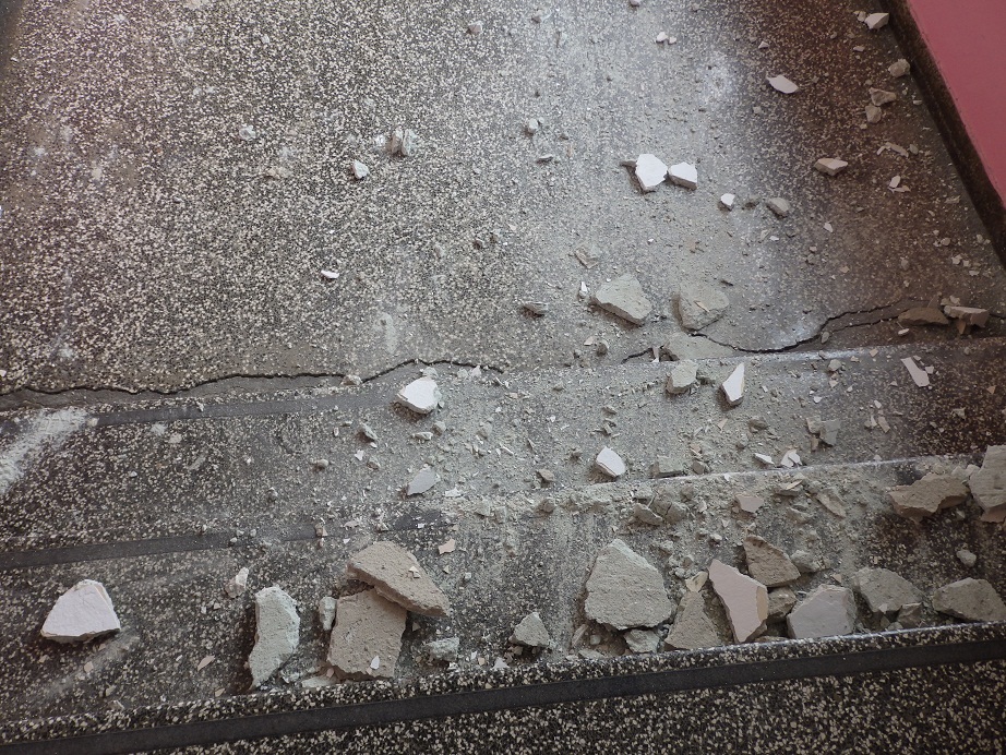 U trenutku kad je zakoračila na treću stepenicu sa stropa na hodniku prvog kata, na prvu i drugu stepenicu stubišta i dio hodnika palo je oko 6 kilograma žbuke. Desilo se to danas oko 11.20.