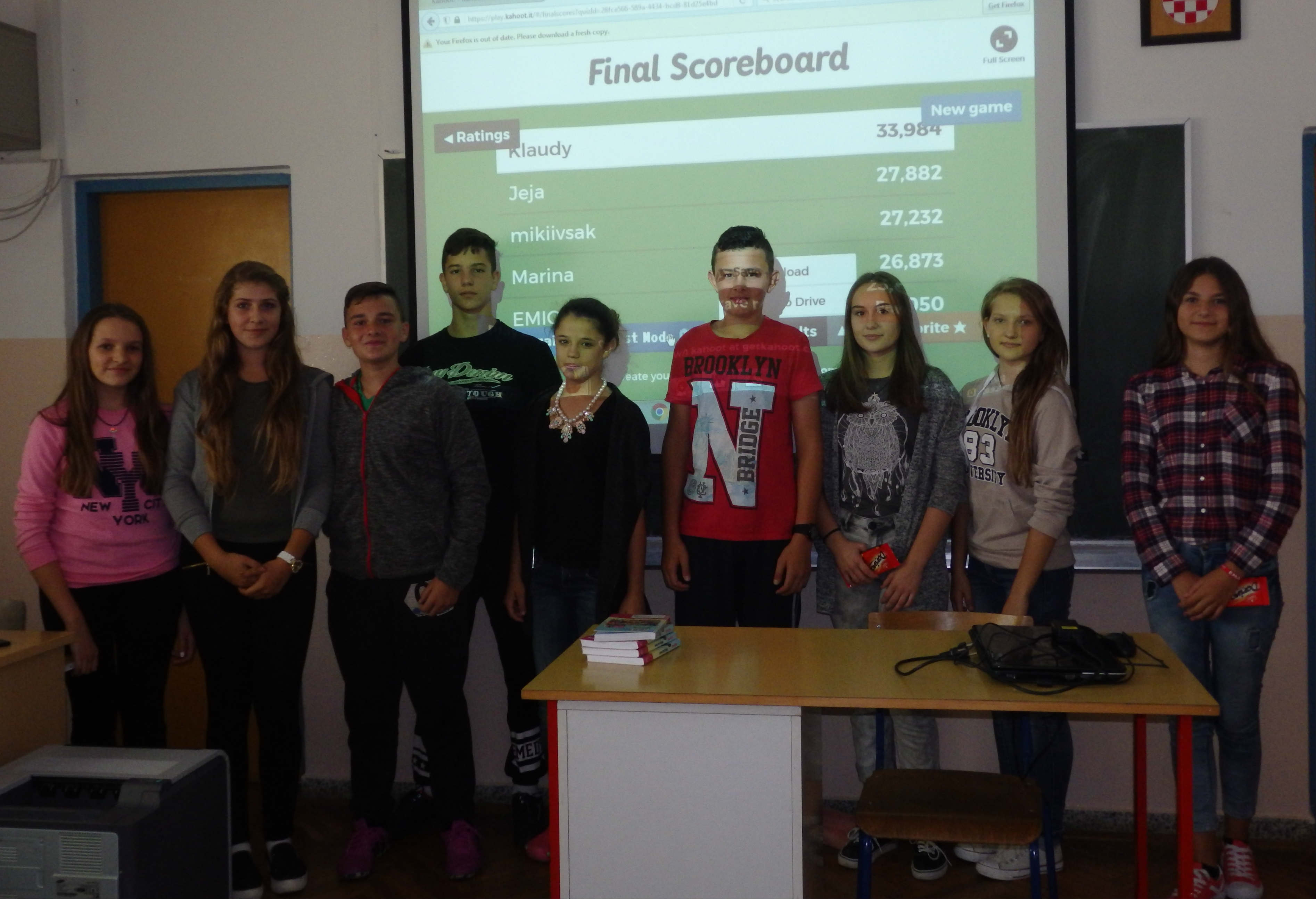 Klaudija Mrazović, učenica 8. a pobjednica je prvog Kahoot kviza održanog ove školske godine. Kviz je bio na temu knjige „Ideš mi na živce“, a dobre rezultate na kvizu postigle su i preostale igračice: Valerija Kos (druga), Tanja Šatrak, Emanuela Črnec, Mirjana Širjan i Martina Hubina.