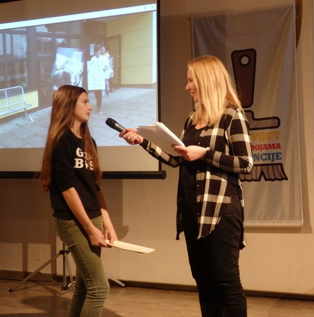 Na priredbi su predstavljeni svi nagrađeni radovi. Bilo je doista izvrsnih plakata, pjesama, filmova…. Sudeći po pljesku, svima nama osobito su se svidjeli nastupi dviju djevojaka u kategoriji Oboji svijet rječju. Barbara Vukas učenica OŠ Sesvete pročitala je dio svoje priče “Sloboda” o odnosu ljudi prema njoj dok je bolovala od leukemije. Druga djevojka, srednjoškolka Kristina Beganović iz Industrijske strojarske škole iz Zagreba, sve nas je ganula dijelom svog rada o problemima mladih majki. Primjeri netolerancije i tolerancije prema mladim majkama u priči “Požurila sam živjeti kao odrasla osoba” osvojili su povjerenstvo, a nas je osvojila i time što je na dodjelu nagradu dovela i svog nekoliko mjeseci starog sina.