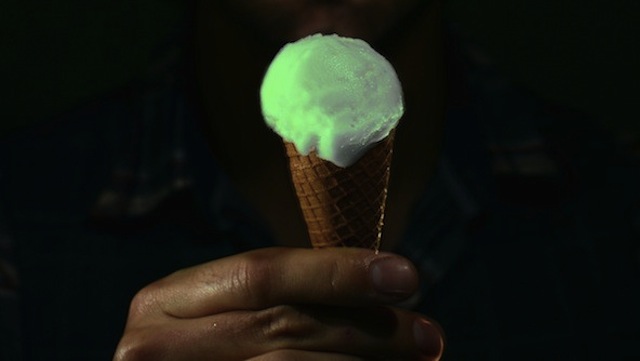 Portal geek.hr piše da postoji i sladoled koji svijetli u mraku nakon što ga poližete. Napravila ga je engleska tvrkta Lick Me I’m Delicious, a košta čak 225$ za kuglicu. Taj sladoled svijetli jer sadrži proteine koji se nalaze u meduzama. Oni reagiraju u dodiru s PH faktorom sline, „uzrokujući da taj protein sjaji dok ližete sladoled.”. (Više o tom sladoledu pogledajte u videu ispod teksta.) Navedena tvrtka kako piše geek.hr proizvodi i druge neobične vrste sladoleda. Neki od takvih su sladoleda s okusom cheddar sira, pečenog bifteka ili džina i tonika.