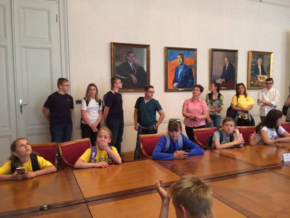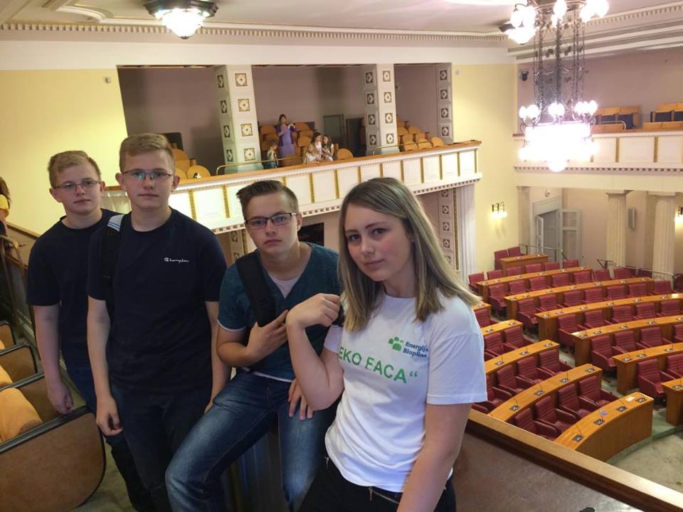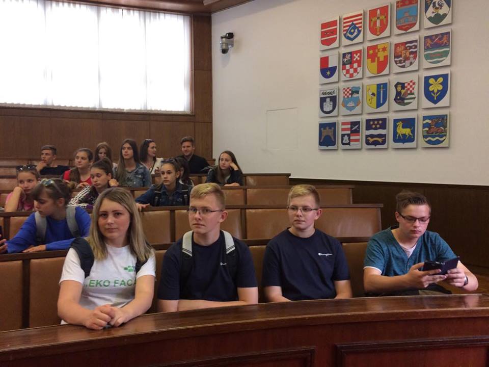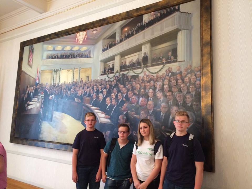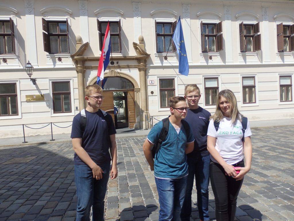 Uslijedila je organizirana posjeta Hrvatskom saboru koji je, kako smo doznali od saborske službenice, najviše predstavničko tijelo i nositelj zakonodavne vlasti u Republici Hrvatskoj. U pratnji naše domaćice obišli smo najvažnije prostore u zgradi Sabora. U Velikoj vijećnici, imali smo prilike fotografirati se na galeriji namijenjenoj građanima. Velika vijećnica bila je prazna jer je u tijeku stanka u radu Sabora zbog lokalnih izbora.