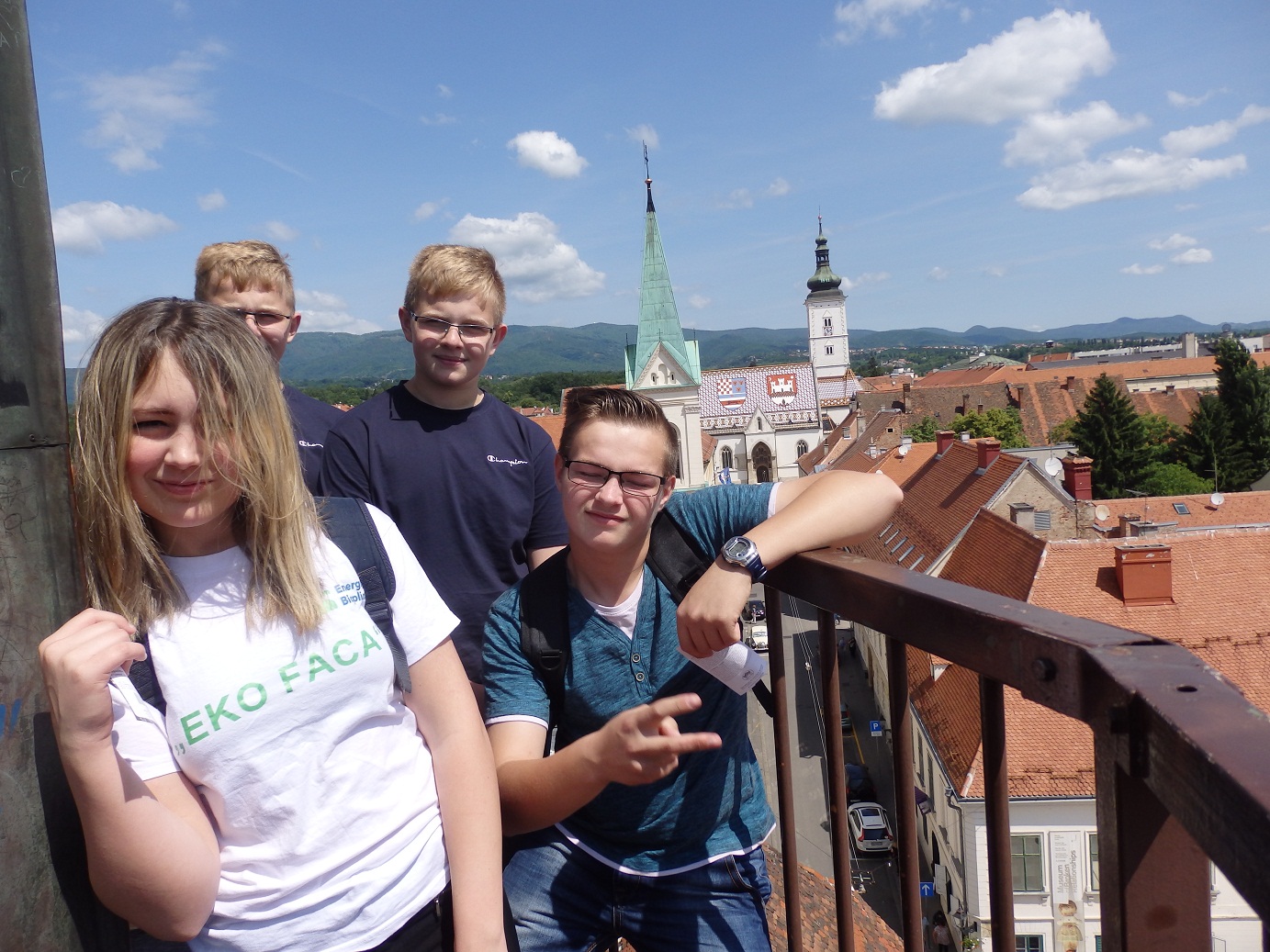 Nakon stresnog predstavljanja malo smo prošetali Gornjim gradom, a zatim smo nekoliko minuta promatrali panoramu Zagreba s vidikovca Kule Lotrščak. Osim po vidikovcu, ta je kula poznata i po tome što iz kule svakog dana točno u podne odjekuje pucanj topa. Taj je običaj započet od Nove godine 1877., kako bi se po topovskom pucnju mogli ravnati zvonari svih gradskih crkava.