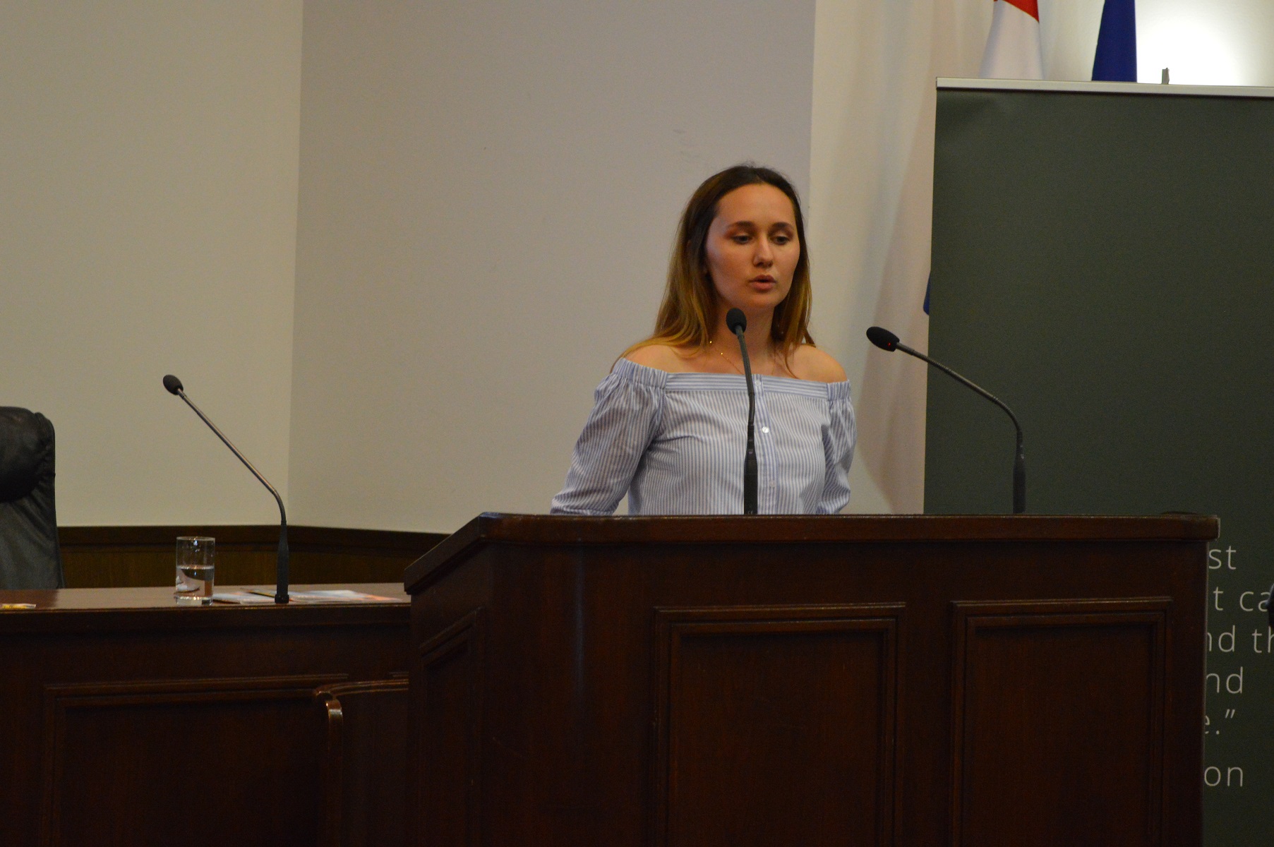 Dobar dan! Prvenstveno bih željela napomenuti kako mi je izrazita čast držati govor pred ovakvom publikom. Ne samo držati govor, već i ovako mlada biti u mogućnosti iskazati svoje mišljenje izvan svoje okoline. Dakle, također i izvan svoje zone udobnosti. Ja sam Ana Marija Ferenčak, učenica trećeg razreda Srednje škole Ivan Seljanec Križevci. Ja sam djevojka od 18 godina i još uvijek smatram kako mogu promijeniti svijet. U nijednom trenutku se nisam dvoumila oko odabira teme i osjećam se počašćeno što imam priliku biti saslušana. Što mogu reći ono o čemu razmišljam već duže vrijeme.