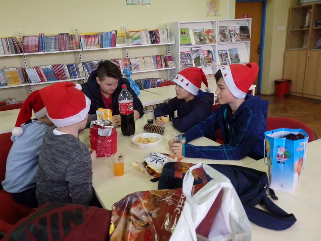 Blagdanskoj atmosferi zadnjeg dana nastave u prvom polugodištu, osim darivanja pridonijele su i razredne proslave. U našem razredu za vrijeme sata hrvatskog s našom razrednicom Ivanom Svrtan počastili smo se grickalicama, bombonima i sokovima. Naravno bilo je i dobre glazbe i bili smo baš veseli. Da je Božić barem svaki dan. /Iva Šantić, 6 c, foto: S.L./