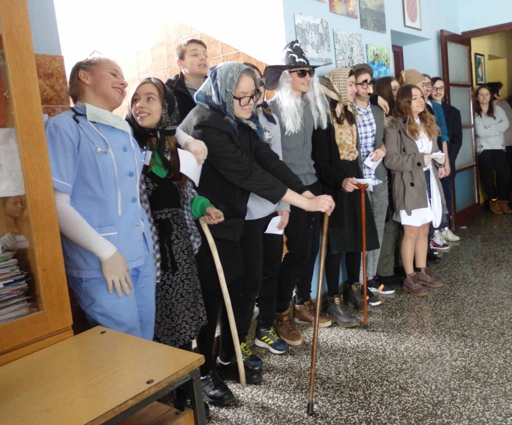 Osim u povorci maskirani učenici svoje su maske, ali i pjevačko i plesačko umijeće, danas mogli pokazati i na karokama održanim u školskom holu. Bilo je veselo, a naši su pjevači pjevali uz podršku i pljesak iz publike. U prvoj smjeni najglasniju podršku dobila je grupa “staraca iz staračkog doma”. Bila je to raspjevana ekipa iz 8. a, a pjevali su pjesmu grupe “Bolje biti pijan, nego star” Plavog orkestra. /Marija-Magdalena Hubina, 6. a; foto: S.L./