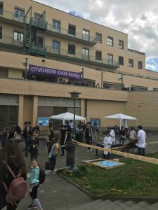 Puno učenika kružilo je po ogromnim zgradama PMF-a i promatralo neka od brojnih događanja. Srećom da je sve bilo dobro označeno putokazima inače se ne bismo snašli. Upravo to traženje i snalaženje po velikim zgradama fakulteta jedan je od razloga zašto bismo i iduće godine željeli ponovno posjetiti Prirodoslovno matematički fakultet. / Elena Bošnjak, Helena Kemenović, Iva Šantić, 6.c ; foto: Ana Pengov/