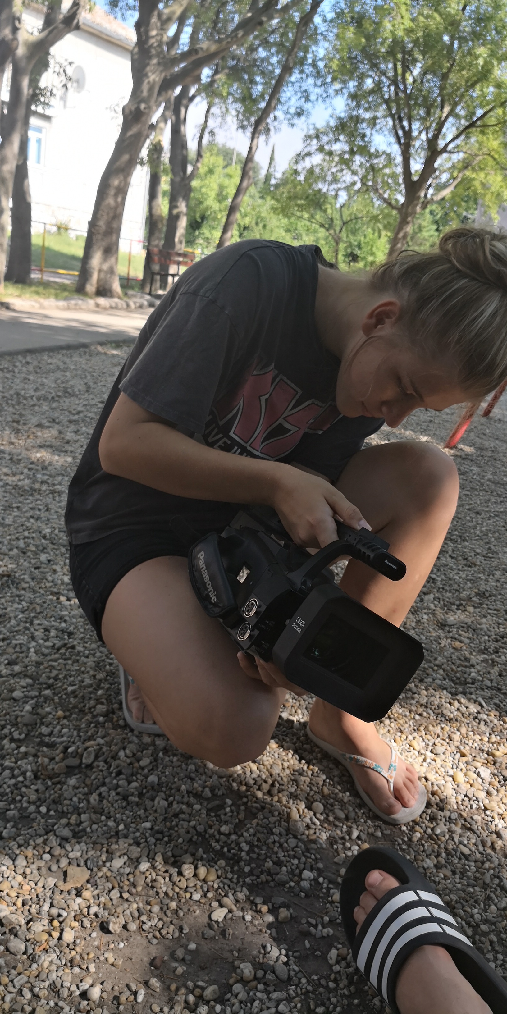 Film smo snimali u različitim ambijentima. Mene je Lara snimala u parku, a neka smo snimanja odradili na igralištu, na plaži, u nekom dvorcu… Kako smo snimali eksperimentali film imali smo zadatak snimiti kadrove na što neobičniji način. Lara je mene snimala iz gotovo okomitog položaja kamere. Kad sam ja snimao nju iskoristio sam vrtuljak u parku. Zavrtio ga i stavio kameru na njega. Za taj sam pristup dobio pohvale od našeg voditelja Poljaka koji nam je tijekom trajanja radionice na vrlo jednostavan način otkrivao zakonitosti snimanja kamerom, a ponajviše pravila manualnog snimanja.