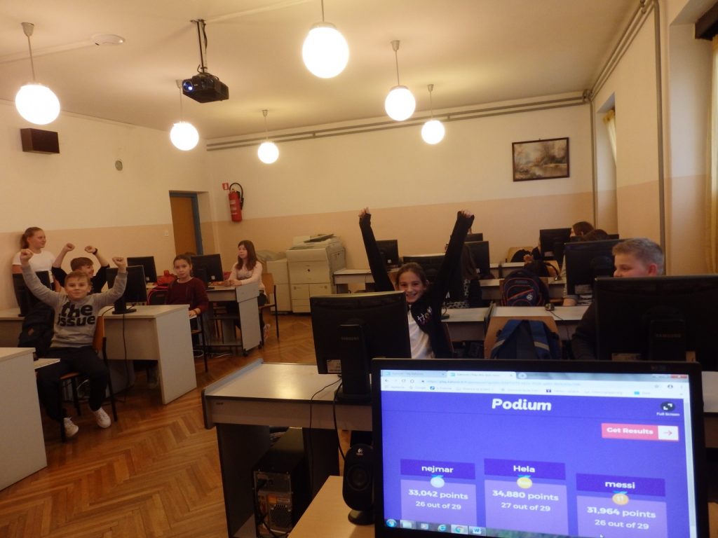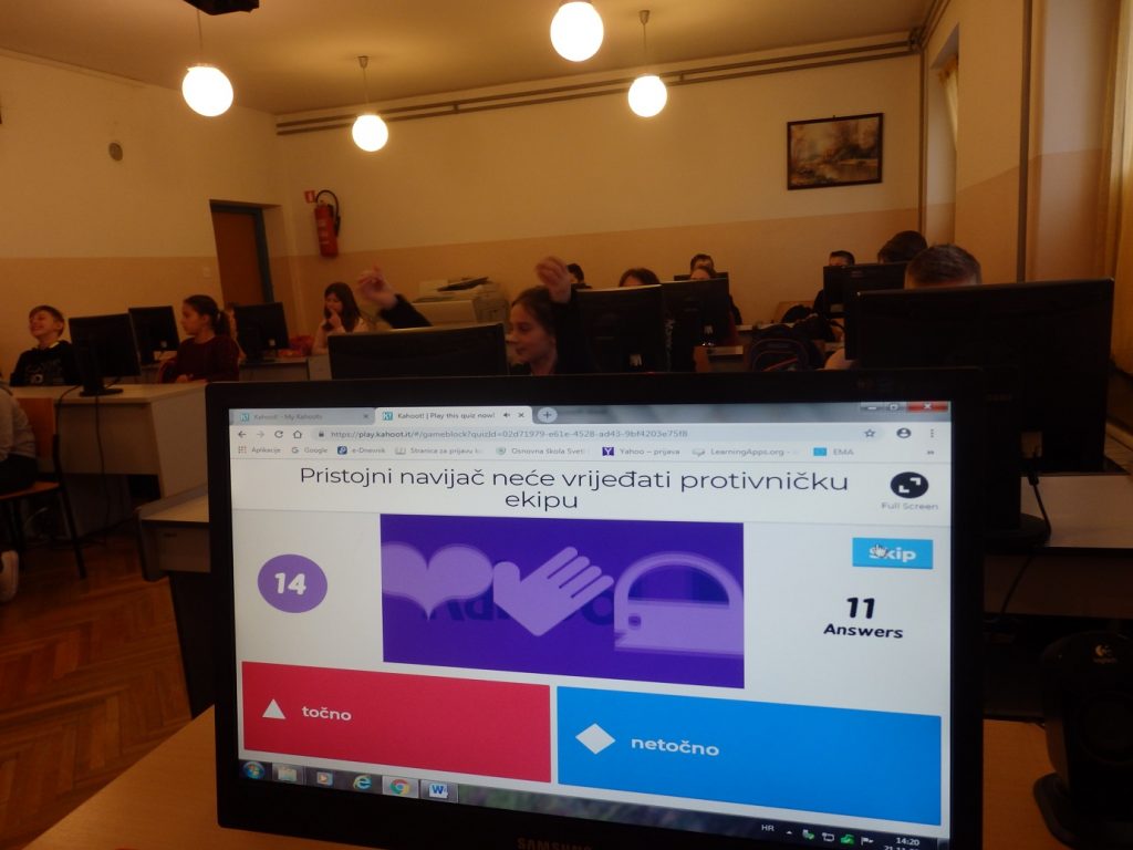 Primijetila sam da je svima bilo zanimljivo i prilikom igranja Kahoot kviza. Svi smo se veselili svakom točnom odgovoru i bodu, a bodovi i plasman se u ovom kvizu vide odmah nakon što istekne vrijeme za odgovor. /Josipa Đuran, 5.a; foto: S. L./