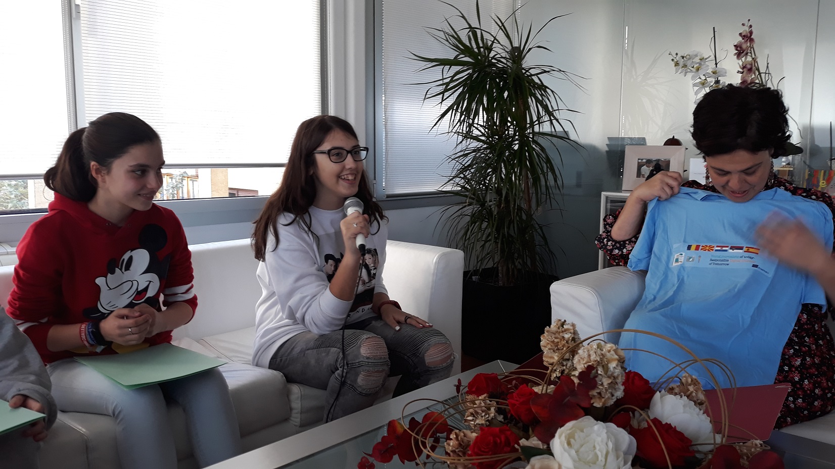 Mi smo učenici škole IES MAESTRE DE CALATRAVA, sudionici Erasmus+ projekta “Mladi novinari danas, odgovorni građani sutra”. U projektu sudjeluje nekoliko europskih zemalja: Rumunjska, Hrvatska, Srbija, Sjeverna Makedonija i Španjolska. Našu gradonačelnicu Pilar Zamoru, posjetili smo kako bismo s njom razgovarali i uručili joj majicu projekta.