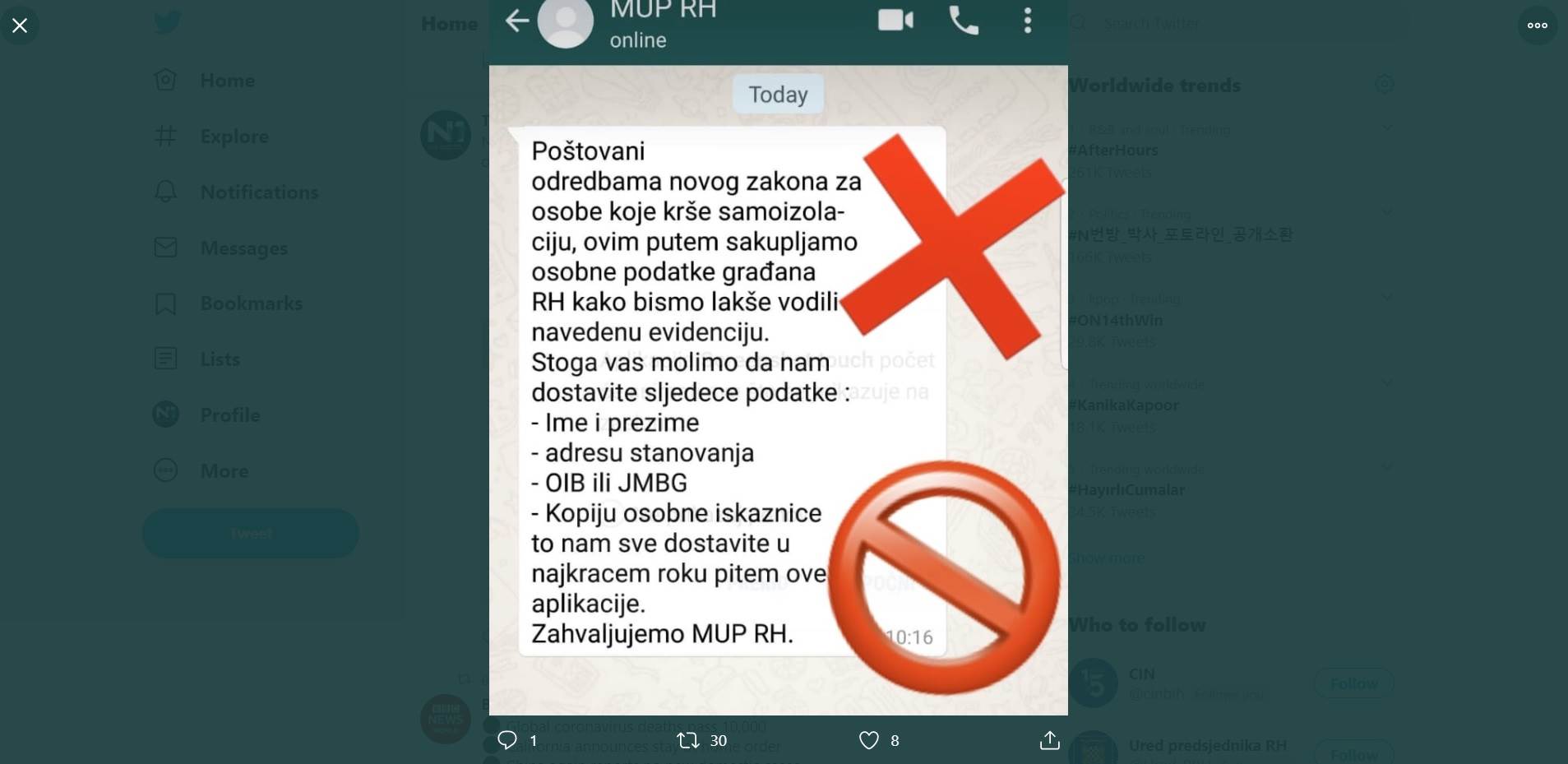 Prije četiri dana u medijima i na društvenim mrežama puno se govorilo o mogućim napadima na kreditne kartice građana. Moguće mete bili su oni građani koji su slijedeći poveznicu poslanu u e-mail poruci otkrili svoje osobne podatke. Da nikako ne otvaraju poslane poveznice na redovitoj dnevnoj konferenciji za medije posvećenoj Corona virusu pozvao je i Davor Božinović, ministar unutarnjih poslova. Baš zato što puno ljudi prati presice o Corona virusu, ovo je ministrovo upozorenje o mogućoj prijevari dobilo veliku publicitet i nadamo se da nije puno ljudi nasjelo prevarantima. U ožujku je pak mobilnim aplikacijama kružila poruka koja nastoji iskoristi situaciju oko Corona visura. Od građana je traženo da zbog izrade evidencije o prekršiteljima samoizolacije, dostave ime i prezime, adresu OIB i JMBG i kopiju osobne.