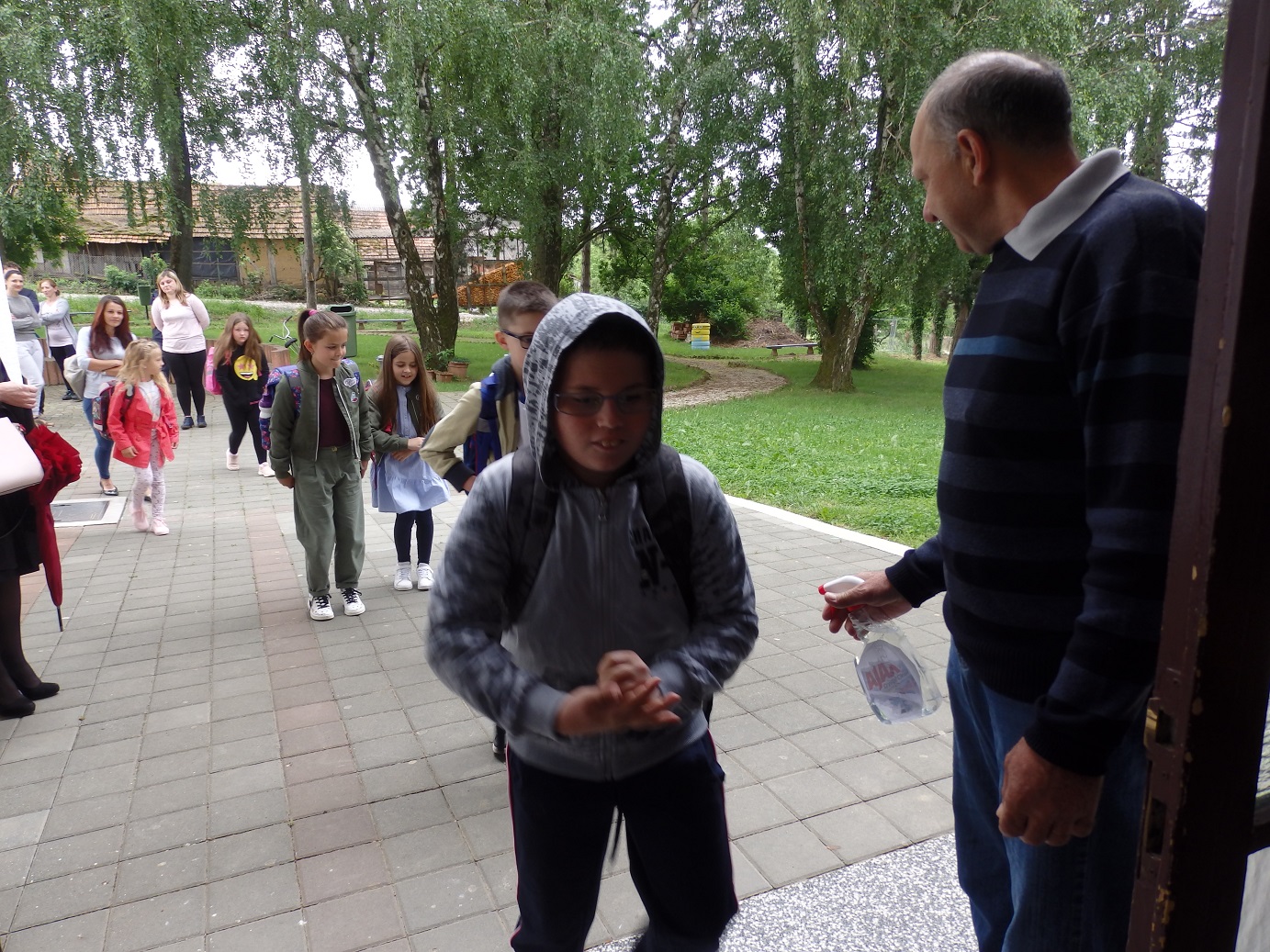 Ispričali su mi da su u školu ulazili jedan po jedan. Na vratima ih je čekao djelatnik škole koji im je špricao ruke dezinfekcijskim sredstvom. Zatim su dezinficirali cipele tako što su prošli preko otirača natopljenog dezinficijensom. Po ulasku u školu obuli su papuče, a u razrede su ušli tek nakon što su sapunom temeljito oprali ruke. /Lea Harča, 7.b; foto: S. L./