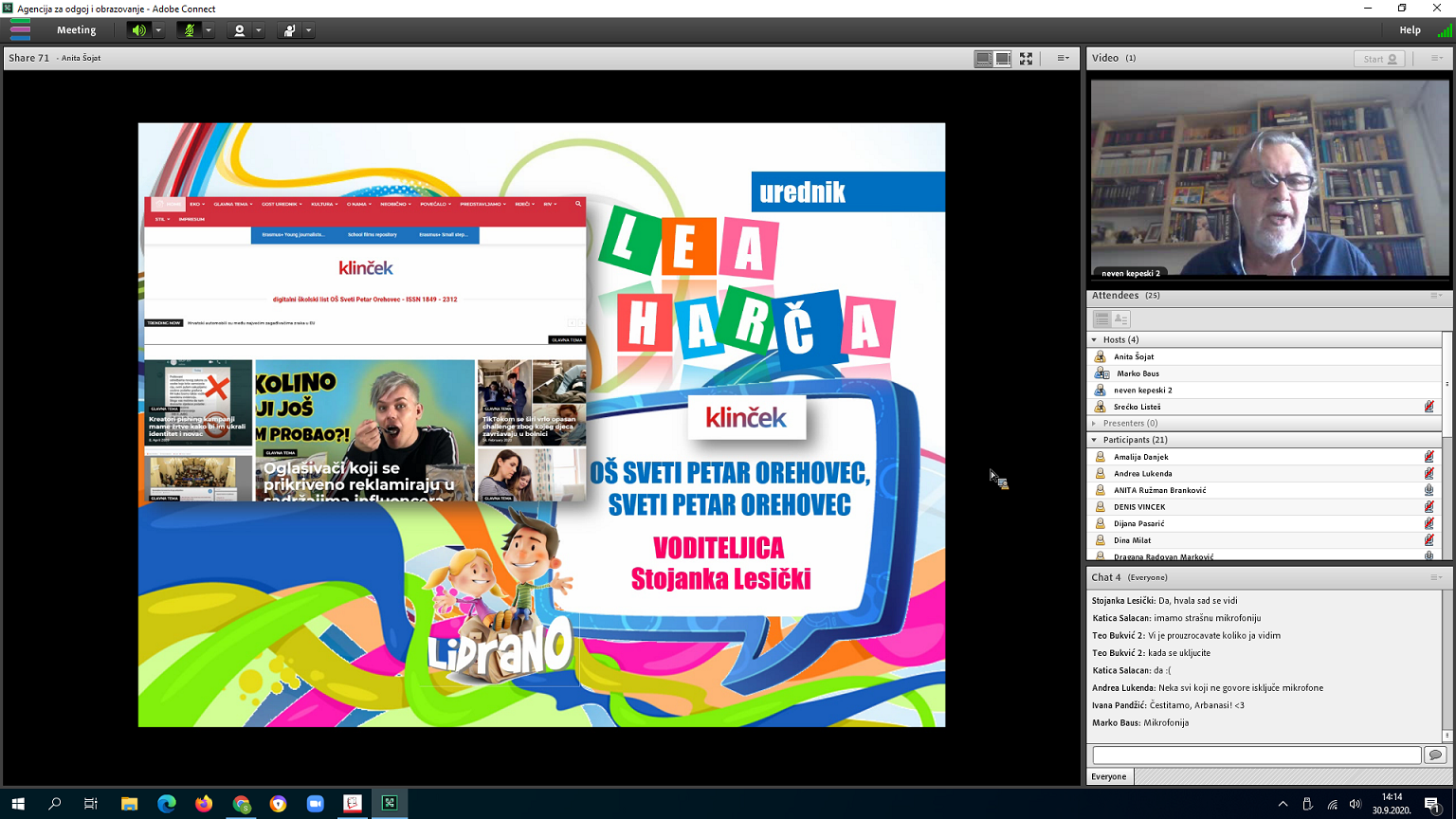 Okrugli stol na kojem se moglo doznati i puno korisnih savjeta o dizajnu školskih listova, jučer je umjesto u Šibenku, kako je to bilo uobičajeno predhodnih godina, održan online putem aplikacije Adobe Conect. Tajnik povjerensta Srećko Listeš, istaknuo je kako se nada da iduće godine susret Lidranovaca neće biti online. Svima se svidio njegov prijedlog da svi prisutni uključe mikrofone i pozdrave se pljeskom te je okrugli stol završio glasnim pljeskanjem. /Lea Harča; foto: snimke ekrana/