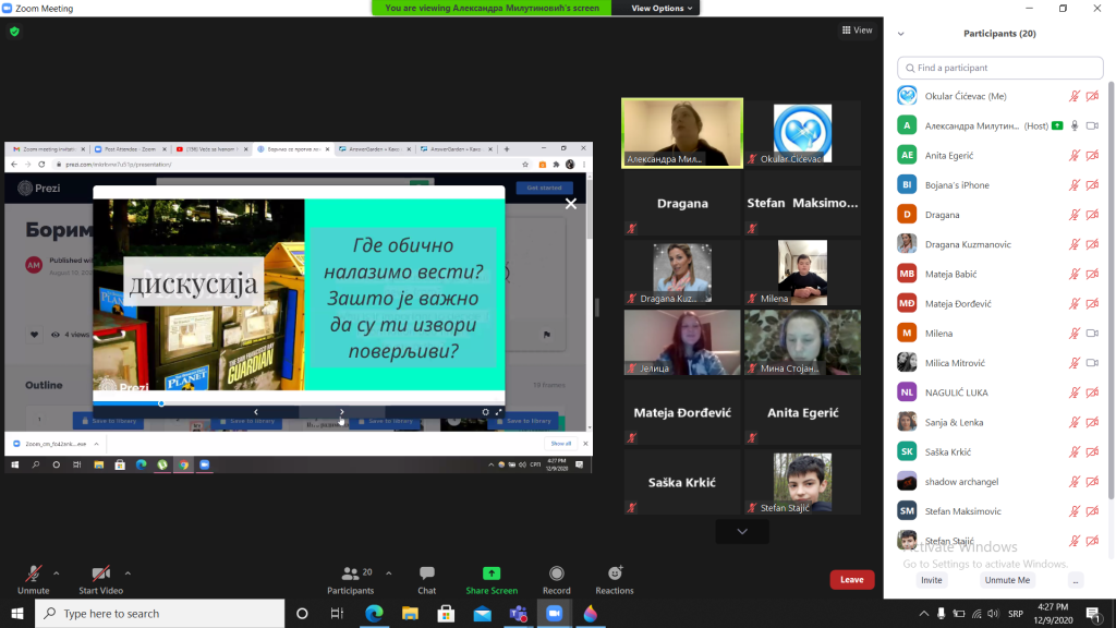 Ovog smo mjeseca imali radionicu na ovu temu koju je putem interneta održala naša učiteljica Aleksandra Milutinović. Kako bi nas privukla, poslužila se trikom. Najavila je radionicu kao događaj na kojem možemo saznati je li istina da je Djed Mraz ove godine dobio dozvolu za kretanje po svijetu i dijeljenje paketa djeci, bez obzira na pandemiju koronavirusa. Međutim, to nije bila lažna vijest. Na kraju radionice saznali smo da se Djed Mraz u Irskoj smije kretati. No, zastupnik u njihovoj skupštini zamolio je djecu da ne budu u njihovim dnevnim boravcima dok im Djed Mraz donosi poklone, nego da odu spavati, kako ne bi upoznali Djeda Mraza i izlagali njega i sebe riziku.