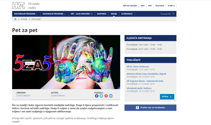 Na Prvom programu Hrvatskog radija jučer u 13.45 emitirana je emisija “Pet za pet”. U emisiji su predstavljene aktivnosti naše škole na području medijske pismenosti koje ostvarujemo kroz novinarsku i filmsku grupu te naše Erasmus+ projekte. Nažalost, ja sam uspjela čuti samo dio emisije jer sam s još nekoliko članova filmske grupe bila na klizanju nakon snimanja našeg novog igranog filma na temu sigurnosti na internetu.