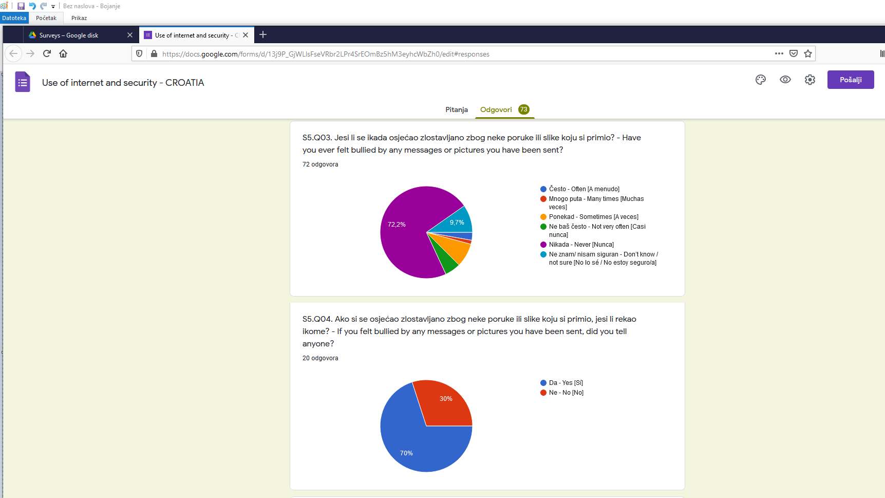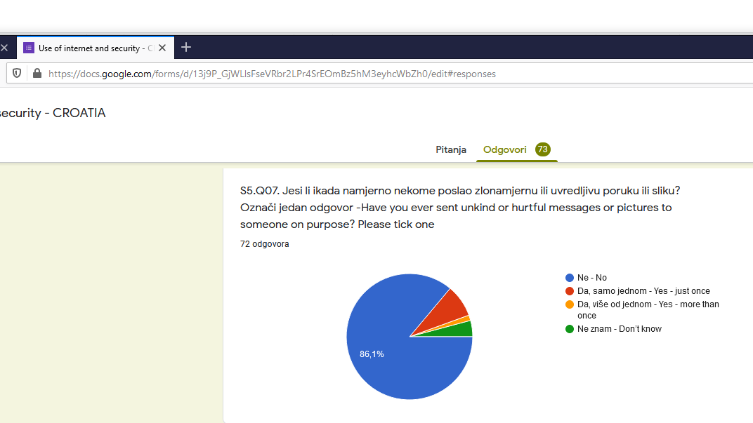 Iz naše škole anketirano je 73 učenika, a njih 18,1 posto (13 učenika) potvrdilo je da je imalo povremenih iskustva sa zlostavljanjem. Od učenika koji su imali problema sa zlostavljanjem ili nisu sigurni da je to bilo zlostavljanje, njih 30 posto (6 učenika) za taj problem nije nikom reklo. Od onih koji su se nekom požalili njih 75 posto (15 učenika) za neprimjerene i povređujuće poruke koje su dobili, rekli su roditeljima. Učiteljima se požalilo samo 10 posto onih koji su primili takve poruke (2 učenika), a prijateljima njih 55 posto (11 učenika). Da i sami ponekad vrijeđaju druge u anketi je potvrdilo 9,7 posto (7 učenika).
