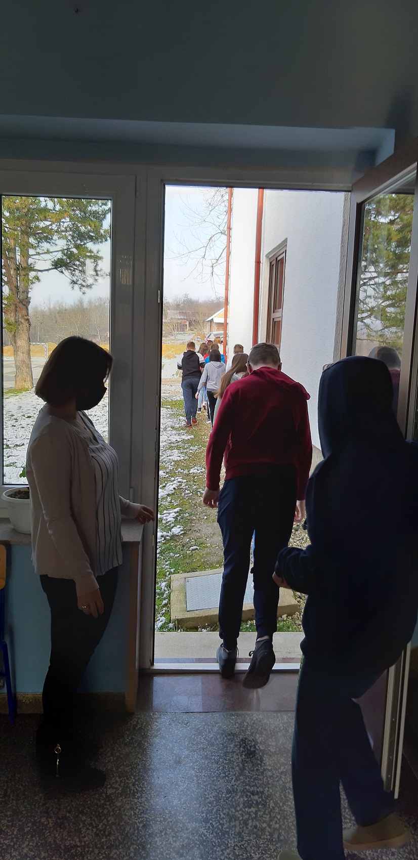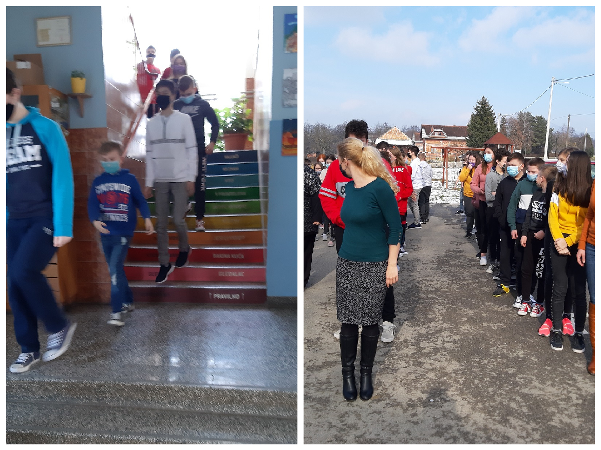 Svi razredi A i B smjene jučer su vježbali evakuaciju u slučaju potresa. Uvježbavanjem evakuacije rukovodio je ravnatelj Stjepan Lučki. Prije same vježbe ravnatelj nam je objasnio da prilikom izlaska iz škole trebamo biti pažljivi i slušati upute učitelja.
