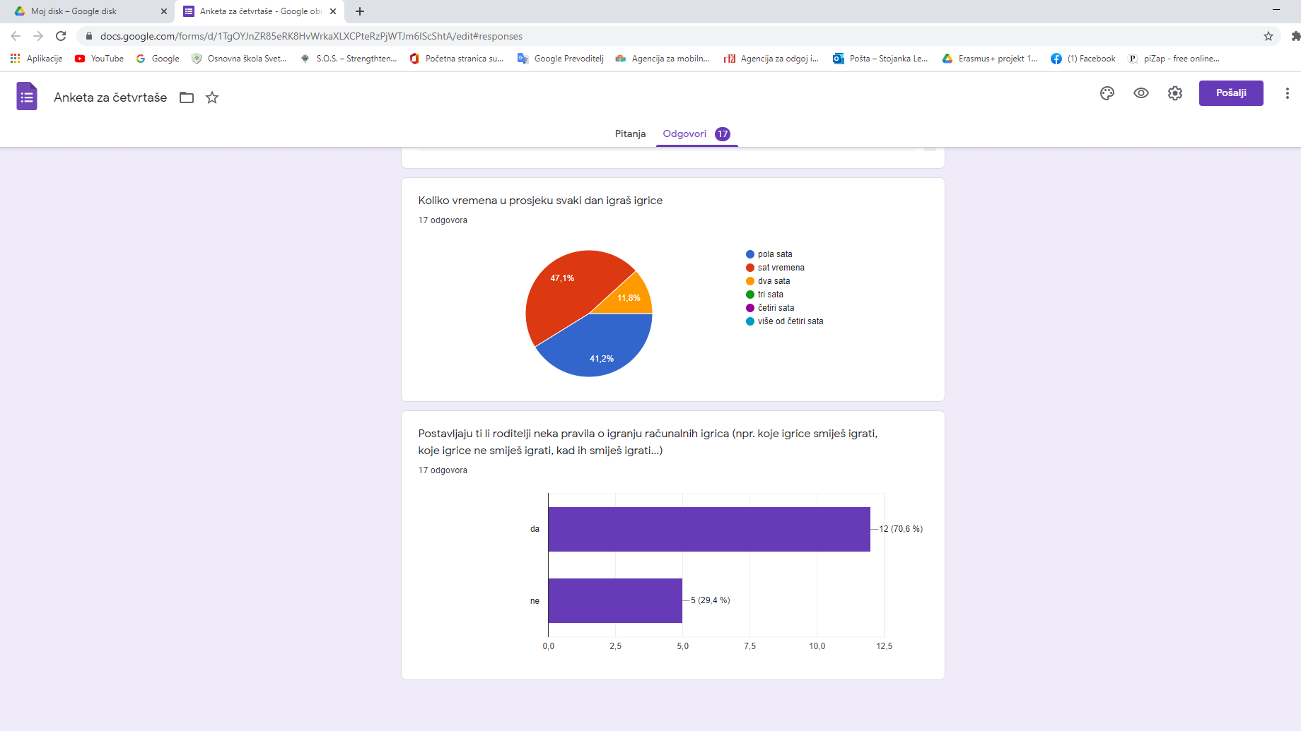 Među rezultatima utvrđenim anketom prvo izdvajamo podatak da od 146 anketirana učenika četvrtih, petih, šestih i sedmih razreda, njih čak 81,7 posto, najčešće videoigre igra na svojim pametnim mobitelima.