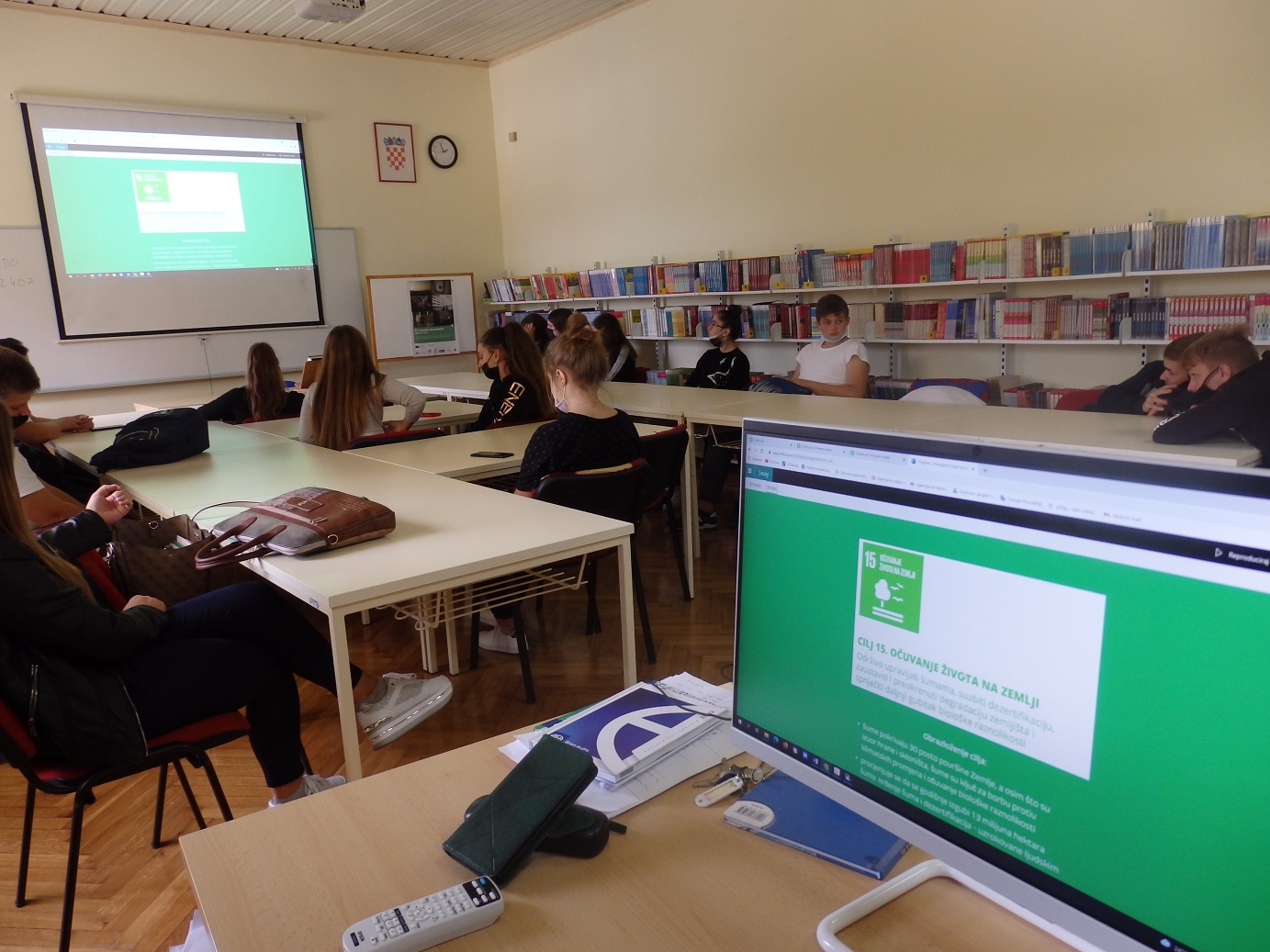 Ovim satom organiziranim u sklopu Eurpskog tjedna održivosti i eTwinning projekta ” Let’s Think Sustainably” (“Razmišljajmo održivo”) mi osmaši započeli smo učiti o održivom razvoju. Knjižničarka nam je najavila da će kroz spomenuti eTwinning projekt biti organiziran natječaj za nabolje održive ideje. Sve škole sudionice u projektu birat će najbolje ideje zato je naš zadatak da osmislimo neke održive aktivnosti koje bismo mogli provoditi u školi.