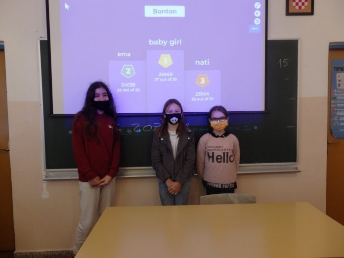 Natalia Zelić osvojila je treće mjesto u poznavanju bontona, Ema Pacur drugo, a Iva Trušček prvo. Kahoot kviz o bontonu učenici 5. c razreda igrali su 7. listopada nakon završetka aktivnosti „Bonton kroz književnost“. To je jedna od aktivnosti koje se u našoj školi provode u sklopu Godine čitanja.