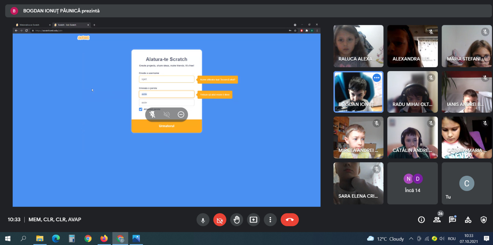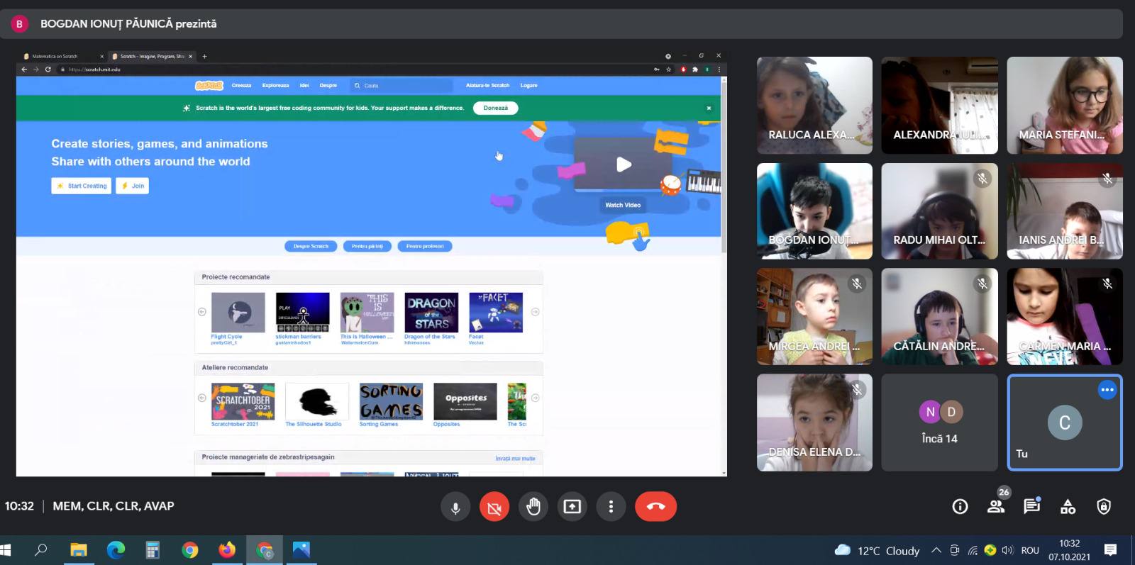 Učenici prvog i šestog razreda škole “Mihai Eminescu” iz Alexandrie (Rumunjska) sudjelovali su u natjecanju “Matematika i Scratch”. Natjecanje je održano online od 5. do 7. listopada 2021. u sklopu europskog događanja “Zajedno programiramo”. To događanje financira Techsoup udruženje, a organizator natjecanja u našoj školi bila učiteljica Corina Voicu Popescu.