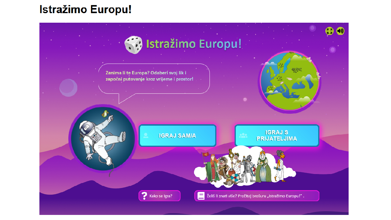 Igrica Istražimo Europu upoznat će igrače s istraživačima, umjetnicima, običajima, popularnim sportovima…. u zemljama EU. O načinima uštede energije može se više doznati kroz Kviz o klimi
