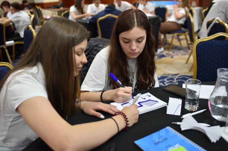 UPSHIFT je jedna od brojnih inicijativa koje podržava UNICEF. Ta inicijativa omogućava radionice društvenih inovacija te ih podupire s mentorstvom, materijalima i financijama. Cilj UPSHIFT-a je potaknuti inovativno i kreativno razmišljanje mladih kako bi razumjeli izazove s kojima se susreću te im pomogli da dođu do inovativnih rješenja u obliku proizvoda ili usluge. Temelji se na metodologiji prenosivog dizajnerskog razmišljanja koja može pomoći nastavnicima i studentima da razviju svoje poduzetničke vještine. Prije svega vještine upravljanje projektima, kritičko mišljenje, timski rad i komunikacijske vještine. / Gorjan Azmanov (9-1); foto: UNICEF/