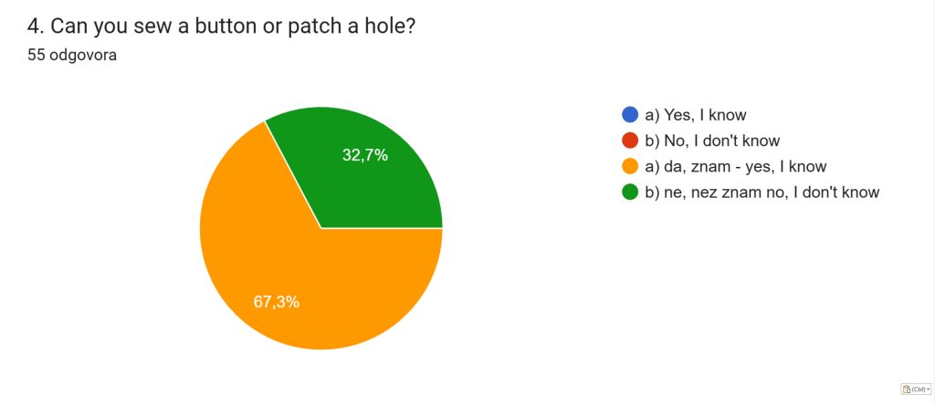 Gotovo 62 % učenika 7.a, 8. b i 8.c (u anketiranju je sudjelovalo 55 učenika) nikad nije kupovalo već nošenu odjeću. Utvrđeno je to anketom – Brza ili održiva moda – koja je provedena prošli tjedan kao dio istoimenog eTwinning projekta. Cilj anketiranja bio je ispitati stavove učenika o shvaćanju koncepta održive mode. No, iako nisu skloni kupovanju u second hand trgovinama dio odgovora naših učenika potvrđuje da neke njihove navike spadaju u održiva ponašanja. Jedna od takvih navika je da većina anketiranih (67 %) zna pokrpati manju rupu na odjeći, a čak gotovo 71% učenika je izjavilo da njihovi ukućani zbog manjeg oštećenja odjeću neće baciti već je je popraviti.
