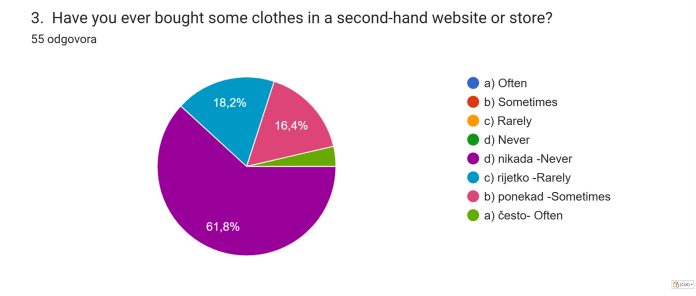 Gotovo 62 % učenika 7.a, 8. b i 8.c (u anketiranju je sudjelovalo 55 učenika) nikad nije kupovalo već nošenu odjeću. Utvrđeno je to anketom – Brza ili održiva moda – koja je provedena prošli tjedan kao dio istoimenog eTwinning projekta. Cilj anketiranja bio je ispitati stavove učenika o shvaćanju koncepta održive mode. No, iako nisu skloni kupovanju u second hand trgovinama dio odgovora naših učenika potvrđuje da neke njihove navike spadaju u održiva ponašanja. Jedna od takvih navika je da većina anketiranih (67 %) zna pokrpati manju rupu na odjeći, a čak gotovo 71% učenika je izjavilo da njihovi ukućani zbog manjeg oštećenja odjeću neće baciti već je je popraviti.
