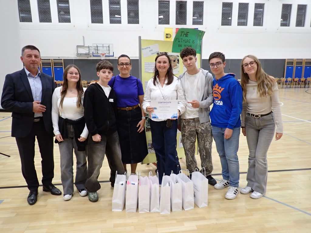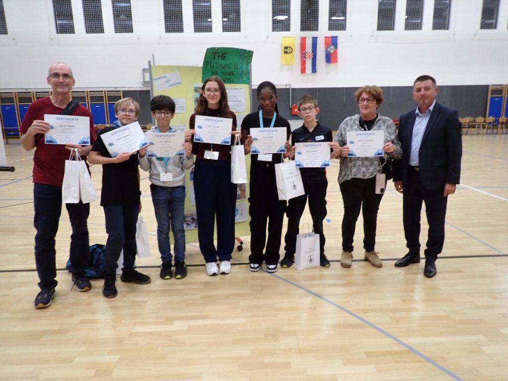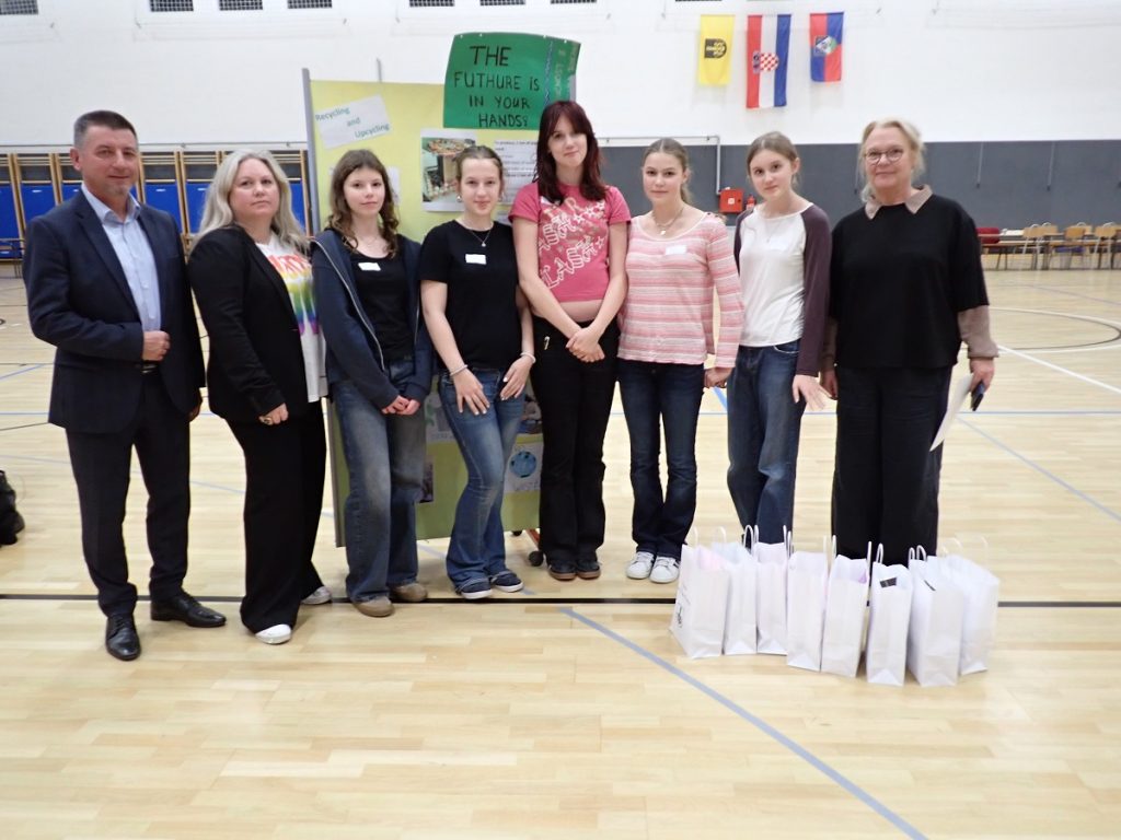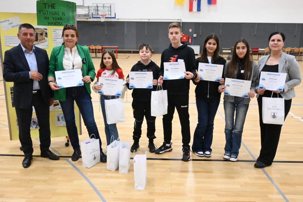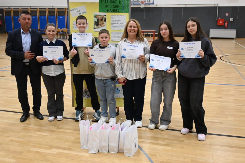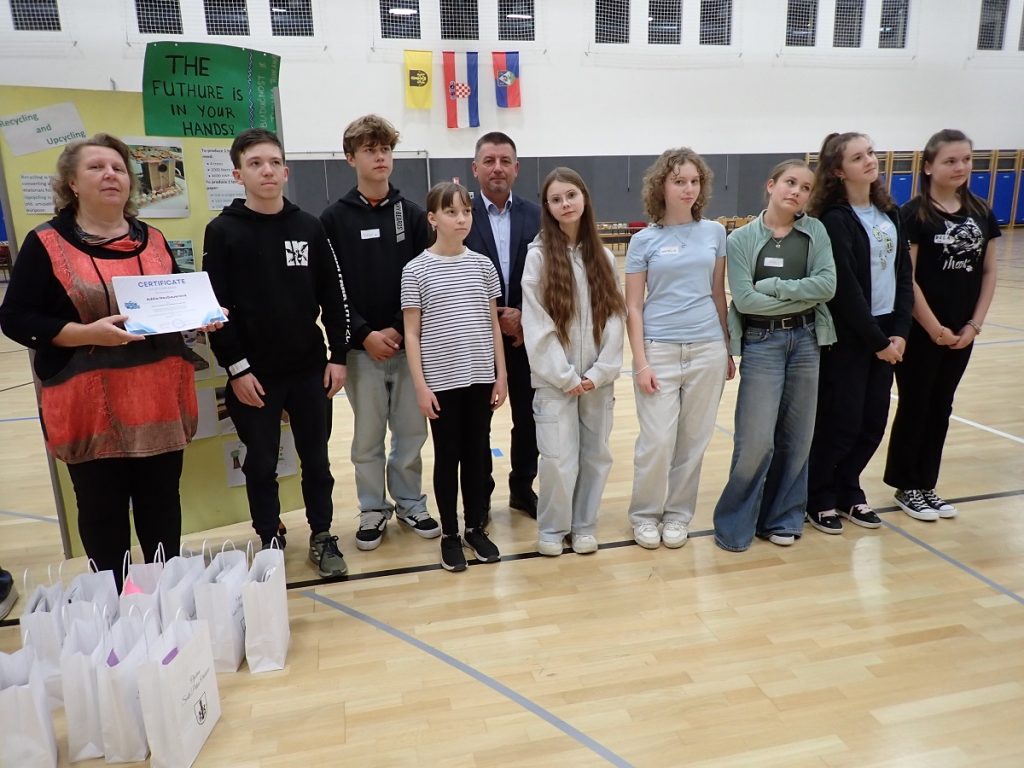 Naše gostima u sportskoj dvorani uručena su priznanja za sudjelovanje na ovoj Erasmus+ mobilnosti. To događanje bilo je u četvrtak, a zborskim pjesmama i plesnim točkama uveličali su ga naš zbor i plesne skupine koje je uvježbala učiteljica Ivana Šiković. Na priredbi su govorili ravnatelj Stjepan Lučki i načelnik Općine Franjo Poljak. Obojica su istaknuli važnost ovakvih mobilnosti za nas mlade. Načelnik nam je na kraju uručio i brojne poklone koje je donirala Općina. U vrećicama su bile majica i čokolada s logom projekta te šalica, penkalo i magnet koji će naše prijatelje podsjećati na ovu mobilnosti. /Ena Dubrava, Dominik Knezić; foto: S. L./