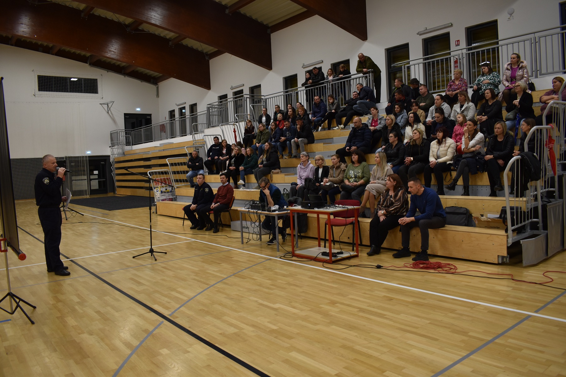 Djelatnici MUP-a Damir Jančijev i Matija Švagelj jučer su u sportskoj dvorani naše škole održali predavanje o sigurnosti djece u prometu. Predavanju je prisustvovalo oko 120 roditelja. U fokusu predavanja bilo je korištenje romobila jer je broj nesreća s romobilima u porastu. Prema statistikama samo je u prvoj polovice ove godine u Hrvatskoj zabilježeno je 257 prometnih nesreća s romobilima, a u njima su 73 osobe teško ozlijeđene, a njih 140 lakše.