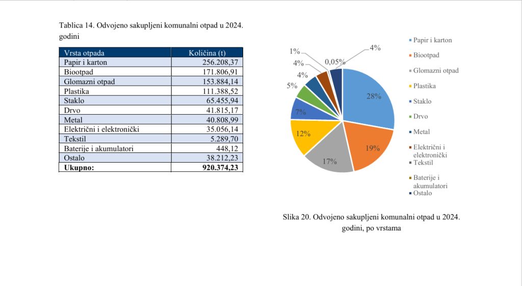 U ukupnim količinama odvojeno sakupljenog komunalnog otpada u 2024. godini najviše je bilo otpada od papira i kartona (28 %). Na drugom mjestu s 19% bio je bio otpad, a na trećem s 17% glomazni otpad. Plastični otpad je na četvrtom mjestu s 12%.