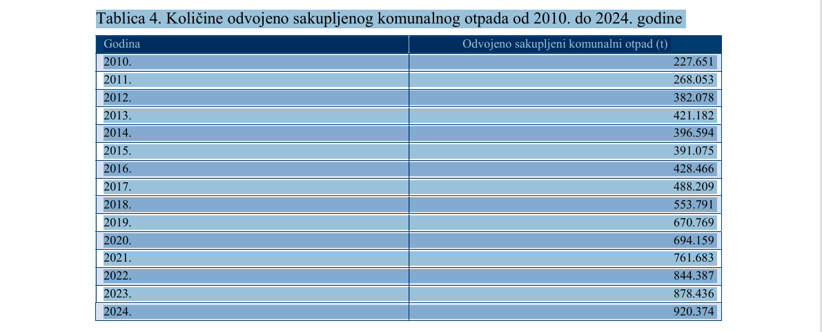 U Hrvatskoj značajne količine komunalnog otpada još završavaju u šumama i drugim nelegalnim odlagalištima, ali činjenica je da smo posljednjih deset godina znatno unaprijedili navike u odvojenom sakupljanju otpada. Prema podatcima iz Nacionalnog izvješće o komunalnom otpadu za 2024. godinu, napredak je znatan. Dok je 2014. odvojeno prikupljeno svega 396.594 tona, godine 2024. odvojeno je skupljeno je 920.374 tona komunalnog otpada ili čak 2,3 puta više.