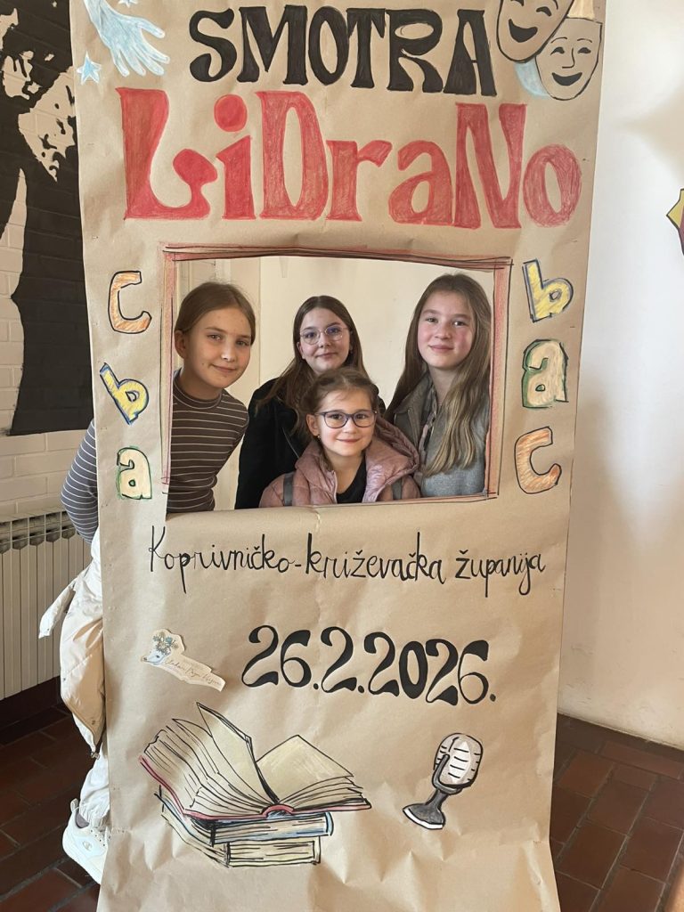 Naša škola uspješno se predstavila na županijskoj razini Smotre LiDraNo, održanoj danas u OŠ „Vladimir Nazor“ u Križevcima. U sve tri kategorije u kojima smo se predstavili predloženi smo za narednu, državnu razinu LiDraNa. To su radijska igra „Znaj i ti imaš sjaj“, skupni nastup „Djevojčica sa šibicama“ u kategoriji dramsko-scenskog izraza te školski digitalni list „Klinček“.