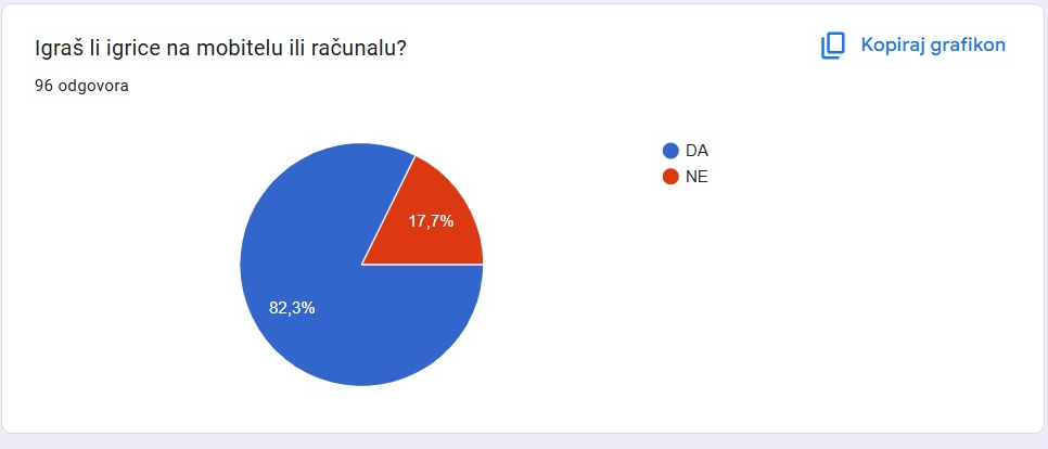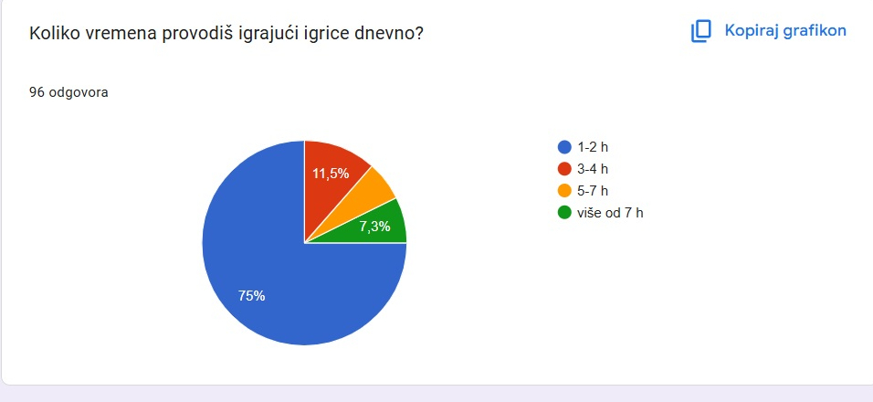 Podatak koji se također ističe dobiven je pitanjem: „Koliko vremena dnevno provodiš igrajući igrice?”. Najviše ispitanika, njih 72 (75 %), odgovorilo je da igrajući provodi između 1 i 2 sata dnevno, ali 24 učenika (25 %) igrice igra više od 3 sata. Između 5 i 7 sati igra šestoro učenika (6,2 %), a više od 7 sati njih sedmero (7,3 %).