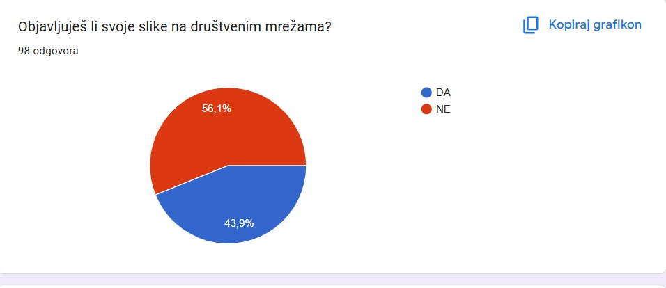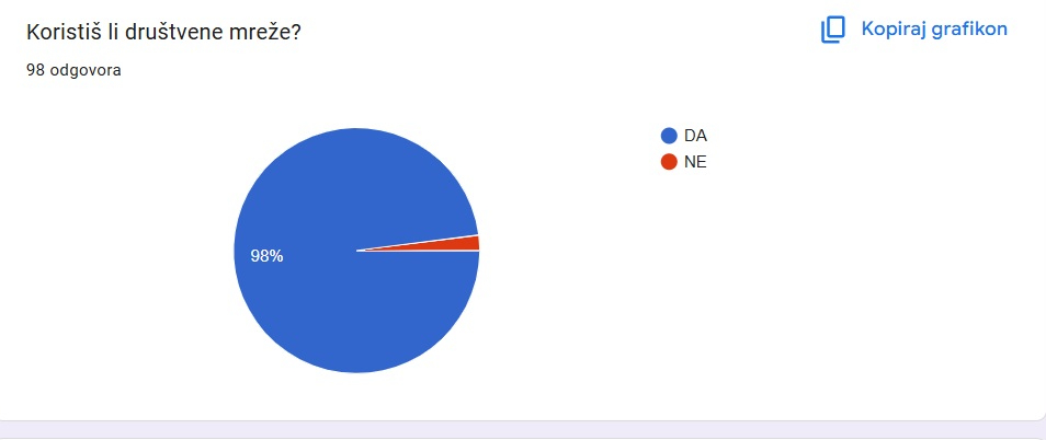 Za početak navodimo da većina društvenih mreža ima pravilo prema kojem ih ne smiju koristiti mlađi od 13 godina. U istraživanju je sudjelovalo 98 učenika (uključujući i učenike petih i šestih razreda), a samo se dvoje učenika izjasnilo da ne koristi društvene mreže.